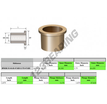 De Bronze Glijlager Met Kraag bekend als BFAI38.10-44.45-47.625-3.175-47.625 meet 38.1 mm in binnendiameter, 44.45 mm in buitendiameter en 47.625 mm lengte.