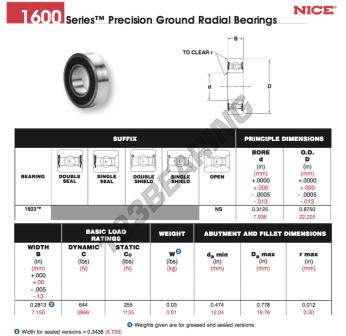 Het Kogellager, bekend als het 1603-NS-NICE NICE, heeft een binnendiameter van 7.938 mm, een buitendiameter van 22.225 mm en een dikte van 7.15 mm.