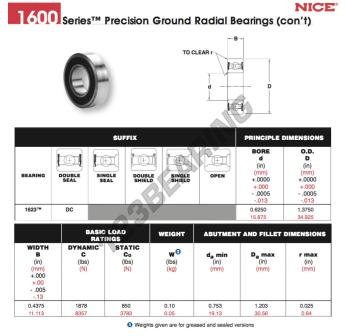 Het Kogellager, bekend als het 1623-DC-NICE NICE, heeft een binnendiameter van 15.875 mm, een buitendiameter van 34.925 mm en een dikte van 11.113 mm.