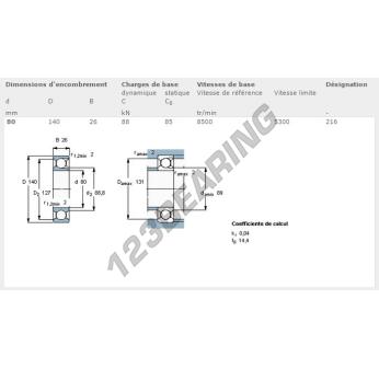 Het Kogellager, bekend als het 216-SKF SKF, heeft een binnendiameter van 80 mm, een buitendiameter van 140 mm en een dikte van 26 mm.