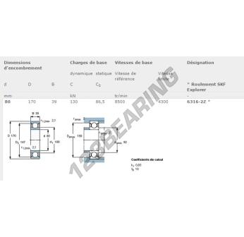 Het Kogellager, bekend als het 6316-ZZ-SKF SKF, heeft een binnendiameter van 80 mm, een buitendiameter van 170 mm en een dikte van 39 mm.