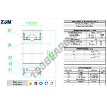 Het Kogellager, bekend als het 686-ZZ-W4.5-ZEN ZEN, heeft een binnendiameter van 6 mm, een buitendiameter van 13 mm en een dikte van 4.5 mm.