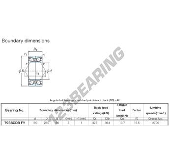 Het Kogellager, bekend als het 7938-CDB-FY-JTEKT JTEKT, heeft een binnendiameter van 190 mm, een buitendiameter van 260 mm en een dikte van 66 mm.