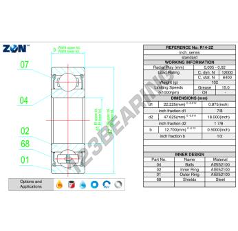 Het Kogellager, bekend als het R14-2Z-ZEN ZEN, heeft een binnendiameter van 22.2 mm, een buitendiameter van 47.6 mm en een dikte van 12.7 mm.