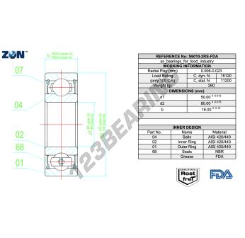 Het Kogellager, bekend als het S6010-2RS-FDA-AISI420-ZEN ZEN, heeft een binnendiameter van 50 mm, een buitendiameter van 80 mm en een dikte van 16 mm.