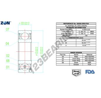 Het Kogellager, bekend als het S6205-2RS-FDA-AISI420-ZEN ZEN, heeft een binnendiameter van 25 mm, een buitendiameter van 52 mm en een dikte van 15 mm.