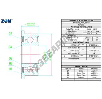 Het Kogellager, bekend als het SFR144-2Z-ZEN ZEN, heeft een binnendiameter van 3.2 mm, een buitendiameter van  6.4 mm en een dikte van 2.8 mm.