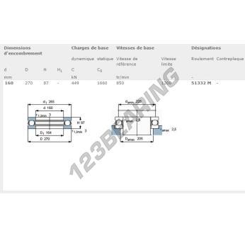 Het Kogeltaatslager, bekend als het 51332-M-SKF SKF, heeft een binnendiameter van 160 mm, een buitendiameter van 270 mm en een dikte van 87 mm.
