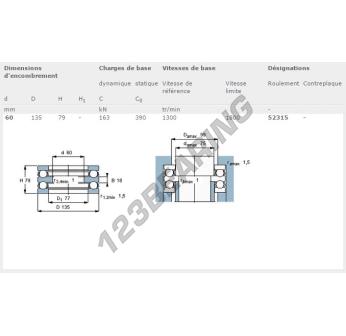 Het Kogeltaatslager, bekend als het 52315-SKF SKF, heeft een binnendiameter van 60 mm, een buitendiameter van 135 mm en een dikte van 79 mm.