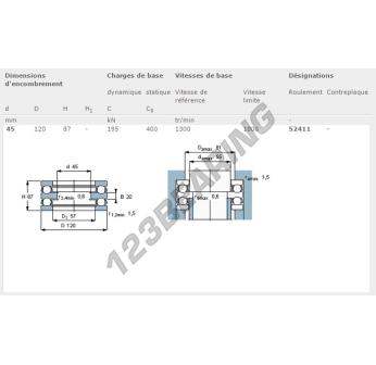Het Kogeltaatslager, bekend als het 52411-SKF SKF, heeft een binnendiameter van 45 mm, een buitendiameter van 120 mm en een dikte van 87 mm.