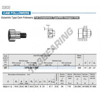 Het Nokrollen, bekend als het CFE20-1-VB-IKO IKO, heeft een binnendiameter van 27 mm, een buitendiameter van 47 mm en een dikte van 24 mm.