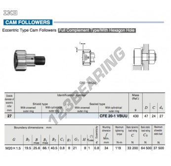 Het Nokrollen, bekend als het CFE20-1-VBUU-IKO IKO, heeft een binnendiameter van 27 mm, een buitendiameter van 47 mm en een dikte van 24 mm.
