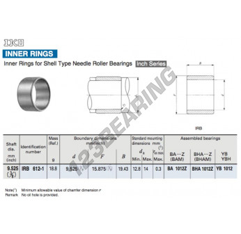 De Binnenring bekend als IRB612-1-IKO IKO meet 9.525 mm in binnendiameter, 15.875 mm in buitendiameter en 19.43 mm lengte. Het is gemaakt in .