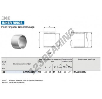 De Binnenring bekend als LRTZ404841-IKO IKO meet 40 mm in binnendiameter, 48 mm in buitendiameter en 41 mm lengte. Het is gemaakt in .