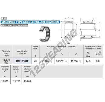 Het Naaldlager, bekend als het BR101812-IKO IKO, heeft een binnendiameter van 15.875 mm, een buitendiameter van 28.575 mm en een dikte van 19.05 mm.