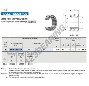 Het Naaldlager, bekend als het NAG4910-UU-IKO IKO, heeft een binnendiameter van 50 mm, een buitendiameter van  72 mm en een dikte van 22 mm.