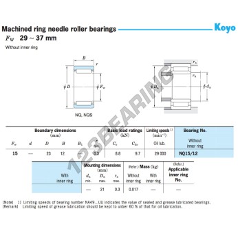 Het Naaldlager, bekend als het NQ15-12-JTEKT JTEKT, heeft een binnendiameter van 15 mm, een buitendiameter van 23 mm en een dikte van 12 mm.