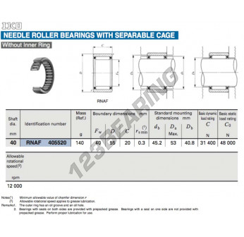 Het Naaldlager, bekend als het RNAF405520-IKO IKO, heeft een binnendiameter van 40 mm, een buitendiameter van 55 mm en een dikte van 20 mm.