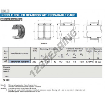 Het Naaldlager, bekend als het RNAFW405540-IKO IKO, heeft een binnendiameter van 40 mm, een buitendiameter van 55 mm en een dikte van 40 mm.