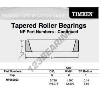Het Kegellager Buitenring, bekend als het NP250023-TIMKEN TIMKEN, heeft een binnendiameter van mm, een buitendiameter van 146.975 mm en een dikte van 32.5 mm.