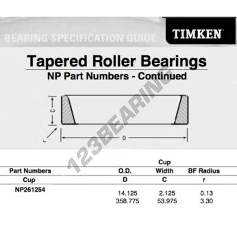 Het Kegellager Buitenring, bekend als het NP261254-TIMKEN TIMKEN, heeft een binnendiameter van mm, een buitendiameter van 358.775 mm en een dikte van 53.975 mm.