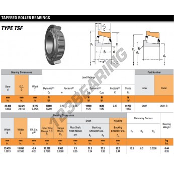 Het Kegellager, bekend als het 2687-2631-B-TIMKEN TIMKEN, heeft een binnendiameter van 25.4 mm, een buitendiameter van 66.421 mm en een dikte van 8.725 mm.