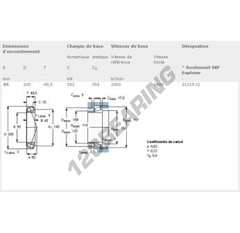 Het Kegellager, bekend als het 31319-J2-SKF SKF, heeft een binnendiameter van 95 mm, een buitendiameter van 200 mm en een dikte van 49.5 mm.