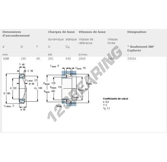 Het Kegellager, bekend als het 33024-SKF SKF, heeft een binnendiameter van 120 mm, een buitendiameter van 180 mm en een dikte van 48 mm.