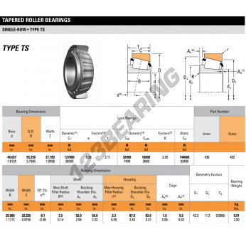 Het Kegellager, bekend als het 436-432-TIMKEN TIMKEN, heeft een binnendiameter van 46.037 mm, een buitendiameter van 95.25 mm en een dikte van 27.783 mm.