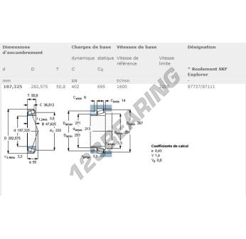 Het Kegellager, bekend als het 87737-87111-SKF SKF, heeft een binnendiameter van 187.33 mm, een buitendiameter van 282.58 mm en een dikte van 50.8 mm.