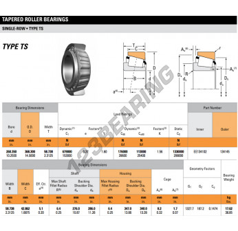 Het Kegellager, bekend als het EE134102-134145-TIMKEN TIMKEN, heeft een binnendiameter van 260.35 mm, een buitendiameter van 368.3 mm en een dikte van 58.738 mm.