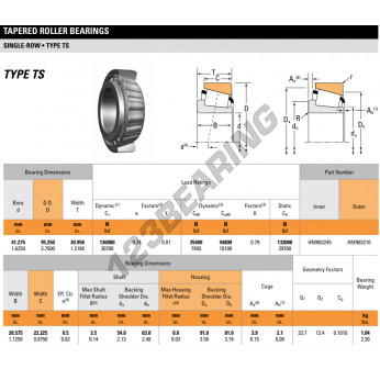 Het Kegellager, bekend als het HM903245-HM903210-TIMKEN TIMKEN, heeft een binnendiameter van 41.275 mm, een buitendiameter van 95.25 mm en een dikte van 30.958 mm.