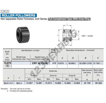 Het Roller, bekend als het CRY32-VUUR-IKO IKO, heeft een binnendiameter van 15.875 mm, een buitendiameter van 50.8 mm en een dikte van 33.338 mm.