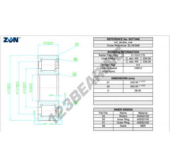 Het Rollager, bekend als het NCF1848-V-ZEN ZEN, heeft een binnendiameter van 240 mm, een buitendiameter van 300 mm en een dikte van 28 mm.