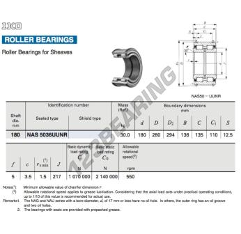 Het Rollager, bekend als het SL045036-PPX-IKO IKO, heeft een binnendiameter van 180 mm, een buitendiameter van 280 mm en een dikte van 136 mm.