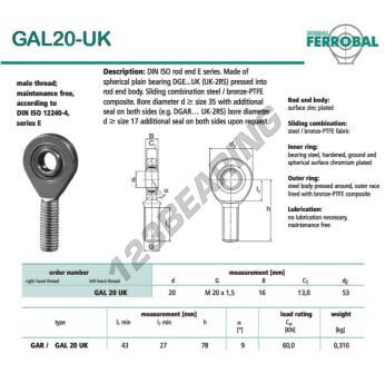 Het Stangkop Sa bekend als GAL20-UK-DURBAL DURBAL heeft een schroefsteek van , een binnendiameter van 20 mm, een buitendiameter van 53 mm en een dikte van 16 mm.