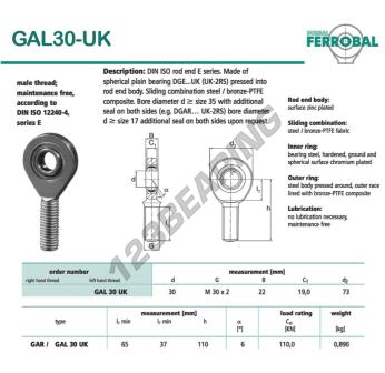 Het Stangkop Sa bekend als GAL30-UK-DURBAL DURBAL heeft een schroefsteek van , een binnendiameter van 30 mm, een buitendiameter van 73 mm en een dikte van 22 mm.