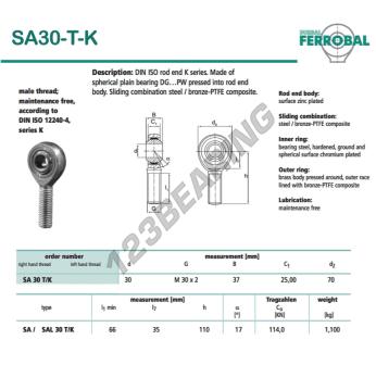 Het Stangkop Sa bekend als SA30-T-K-DURBAL DURBAL heeft een schroefsteek van , een binnendiameter van 30 mm, een buitendiameter van 70 mm en een dikte van 37 mm.