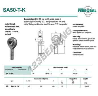 Het Stangkop Sa bekend als SA50-T-K-DURBAL DURBAL heeft een schroefsteek van ,  een binnendiameter van 50 mm, een buitendiameter van 117 mm en een dikte van 60 mm.