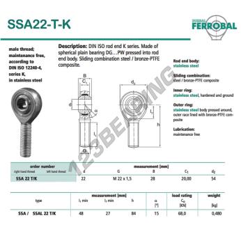 Het Stangkop Sa bekend als SSA22-T-K-DURBAL DURBAL heeft een schroefsteek van , een binnendiameter van 22 mm, een buitendiameter van 54 mm en een dikte van 28 mm.