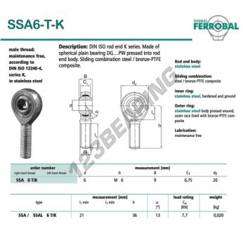 Het Stangkop Sa bekend als SSA6-T-K-DURBAL DURBAL heeft een schroefsteek van , een binnendiameter van 6 mm, een buitendiameter van 20 mm en een dikte van 9 mm.