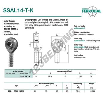 Het Stangkop Sa bekend als SSAL14-T-K-DURBAL DURBAL heeft een schroefsteek van , een binnendiameter van 14 mm, een buitendiameter van 36 mm en een dikte van 19 mm.