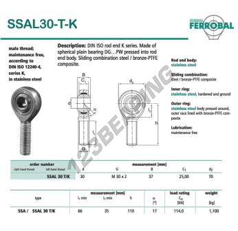 Het Stangkop Sa bekend als SSAL30-T-K-DURBAL DURBAL heeft een schroefsteek van , een binnendiameter van 30 mm, een buitendiameter van 70 mm en een dikte van 37 mm.