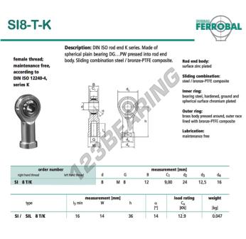 Het Si Stangkop bekend als SI8-T-K-DURBAL DURBAL heeft een interne diameter van 8 mm, een externe diameter van 24 mm en een dikte van 12 mm.